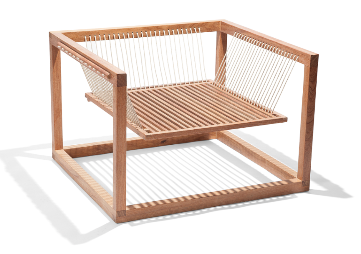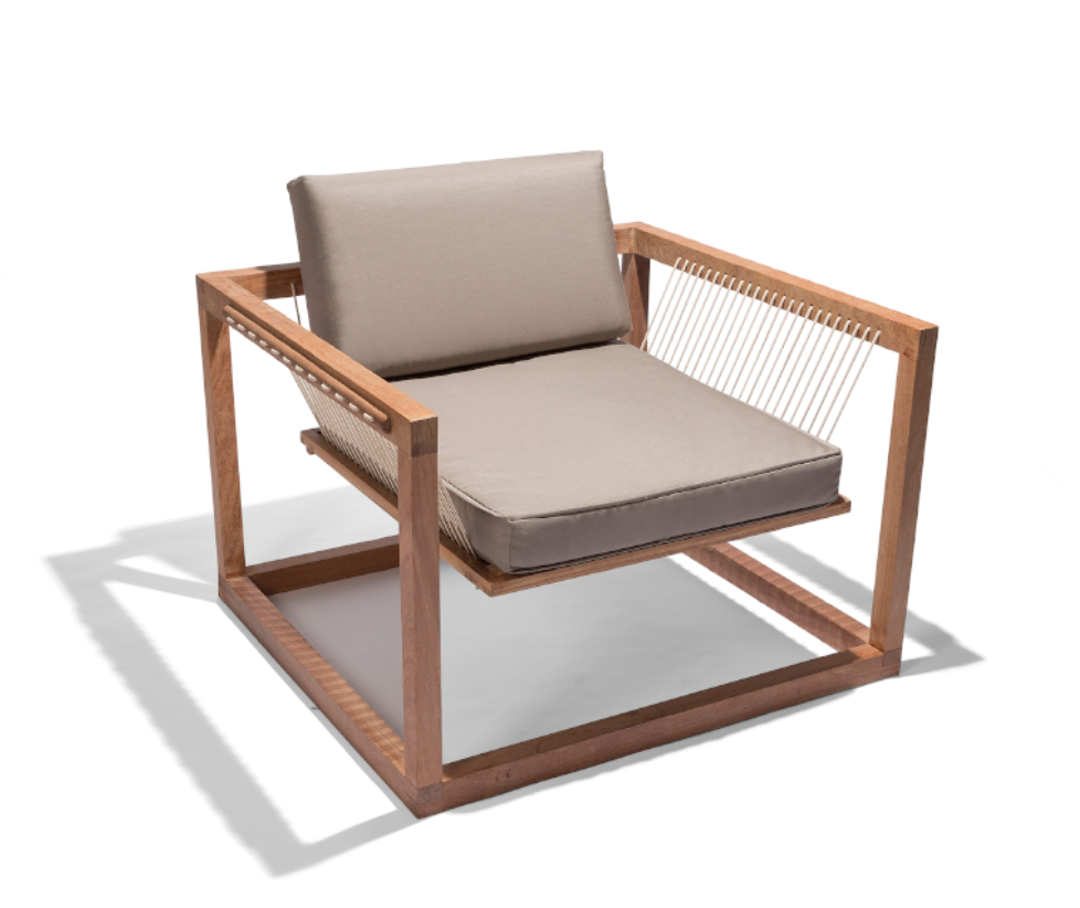Made of Cumarú wood, also with cords that swings the seat almost like a hammock. For indoor and outdoor use. Different types of fabric and colors available.