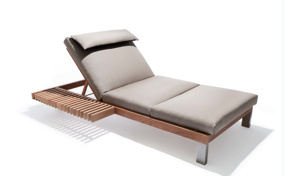 From the Ripas collection, this is a generously sized lounge chair, made of solid FSC certified Cumaru wood, yet very easy to move thanks to its wheels, which are a statement detail in itself. The design integrates a shelf that serves as a side table. Cushions are made with Sunbrellaq fabric, several colors to choose from.